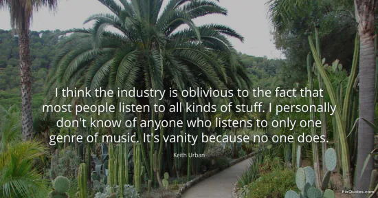 Urban, Keith. (2026, January 16). I think the industry is oblivious to the fact that most people listen to all kinds of stuff. I personally don't know of anyone who listens to only one genre of music. It's vanity because no one does. FixQuotes. https://fixquotes.com/quotes/i-think-the-industry-is-oblivious-to-the-fact-136849/