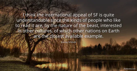 Schmidt, Stanley. (2026, February 16). I think the international appeal of SF is quite understandable since the kinds of people who like to read it are, by the nature of the beast, interested in other cultures, of which other nations on Earth are the closest available example. FixQuotes. https://fixquotes.com/quotes/i-think-the-international-appeal-of-sf-is-quite-134721/
