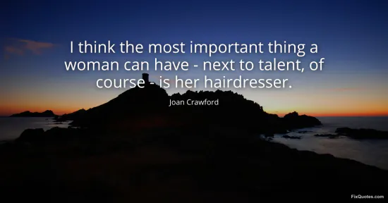 Crawford, Joan. "I think the most important thing a woman can have - next to talent, of course - is her hairdresser." FixQuotes. January 16, 2026. https://fixquotes.com/quotes/i-think-the-most-important-thing-a-woman-can-have-114073/.