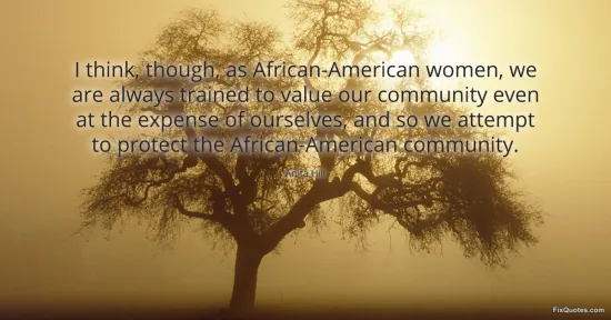 "I think, though, as African-American women, we are always trained to value our community even at the expense of ourselves, and so we attempt to protect the African-American community." FixQuotes, 17 Jan. 2026, https://fixquotes.com/quotes/i-think-though-as-african-american-women-we-are-44163/. Accessed 21 Feb. 2026.