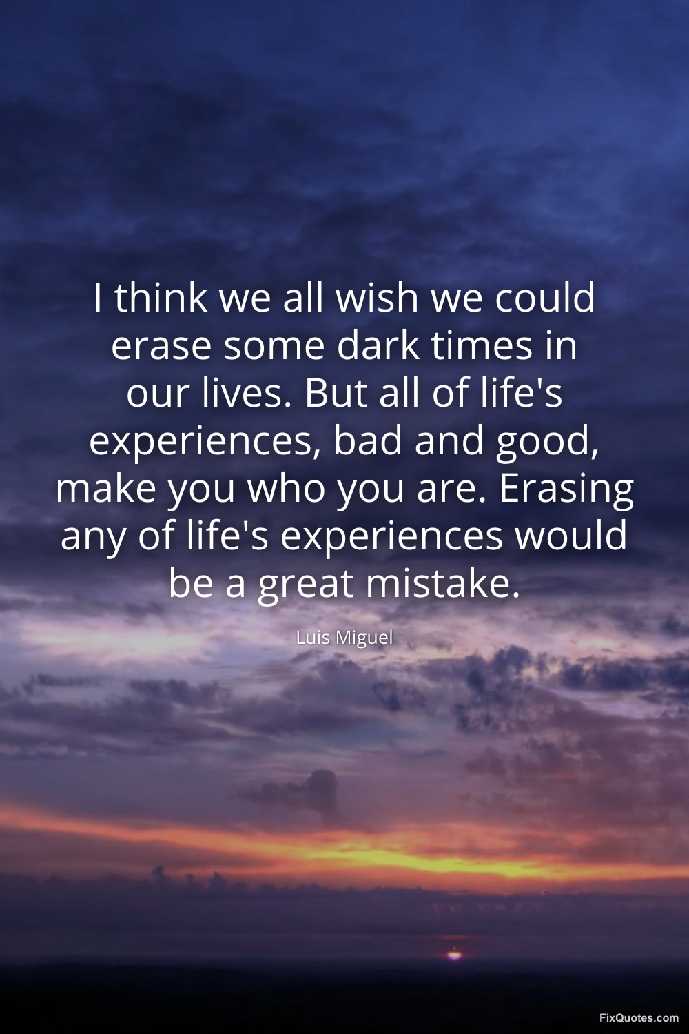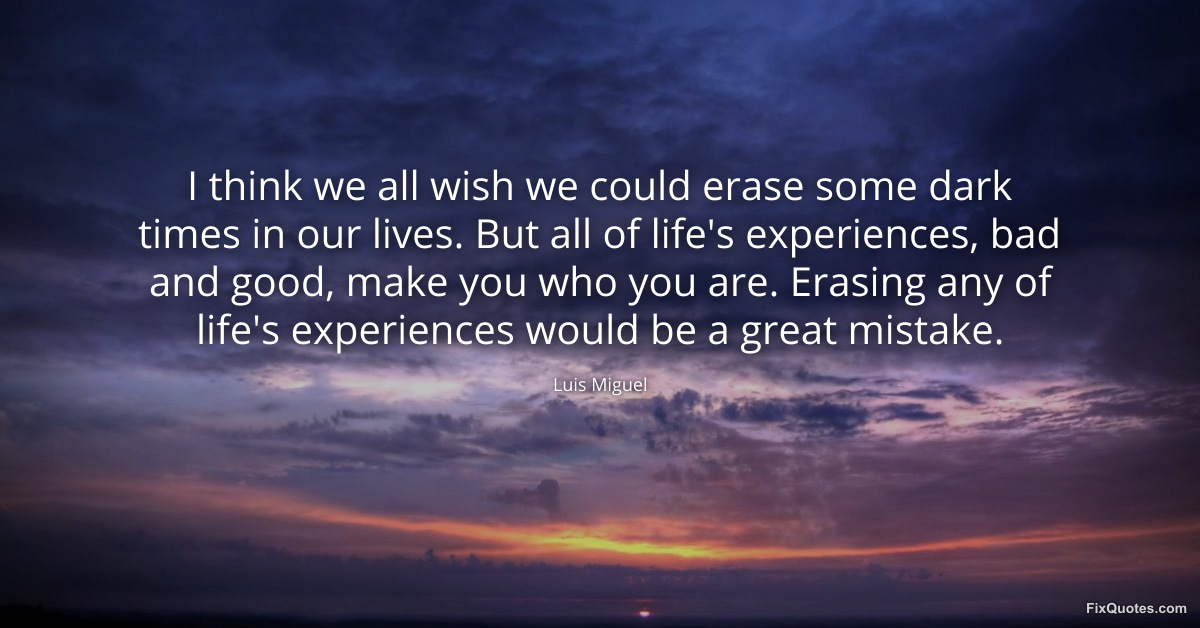 Miguel, Luis. (2026, February 18). I think we all wish we could erase some dark times in our lives. But all of life's experiences, bad and good, make you who you are. Erasing any of life's experiences would be a great mistake. FixQuotes. https://fixquotes.com/quotes/i-think-we-all-wish-we-could-erase-some-dark-74487/