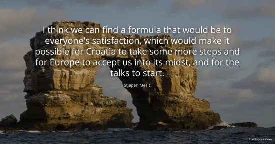 "I think we can find a formula that would be to everyone's satisfaction, which would make it possible for Croatia to take some more steps and for Europe to accept us into its midst, and for the talks to start." FixQuotes, 16 Jan. 2026, https://fixquotes.com/quotes/i-think-we-can-find-a-formula-that-would-be-to-125298/. Accessed 11 Feb. 2026.