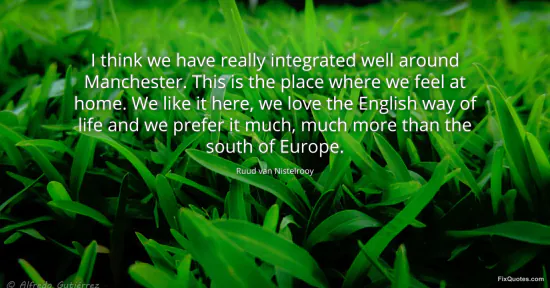 Nistelrooy, Ruud van. "I think we have really integrated well around Manchester. This is the place where we feel at home. We like it here, we love the English way of life and we prefer it much, much more than the south of Europe." FixQuotes. January 17, 2026. https://fixquotes.com/quotes/i-think-we-have-really-integrated-well-around-81623/.