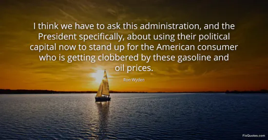 Wyden, Ron. "I think we have to ask this administration, and the President specifically, about using their political capital now to stand up for the American consumer who is getting clobbered by these gasoline and oil prices." FixQuotes. January 16, 2026. https://fixquotes.com/quotes/i-think-we-have-to-ask-this-administration-and-134626/.