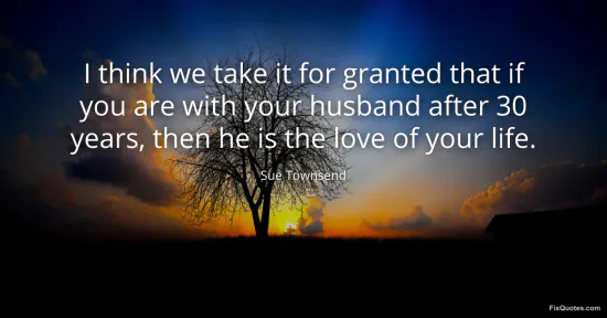 Townsend, Sue. "I think we take it for granted that if you are with your husband after 30 years, then he is the love of your life." FixQuotes. January 16, 2026. https://fixquotes.com/quotes/i-think-we-take-it-for-granted-that-if-you-are-116876/.