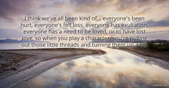 Ruffalo, Mark. "I think we've all been kind of... everyone's been hurt, everyone's felt loss, everyone has exultation, everyone has a need to be loved, or to have lost love, so when you play a character, you're pulling out those little threads and turning them up a bit." FixQuotes. January 15, 2026. https://fixquotes.com/quotes/i-think-weve-all-been-kind-of-everyones-been-hurt-156756/.