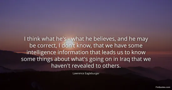 Eagleburger, Lawrence. "I think what he's - what he believes, and he may be correct, I don't know, that we have some intelligence information that leads us to know some things about what's going on in Iraq that we haven't revealed to others." FixQuotes. January 18, 2026. https://fixquotes.com/quotes/i-think-what-hes-what-he-believes-and-he-may-be-5994/.