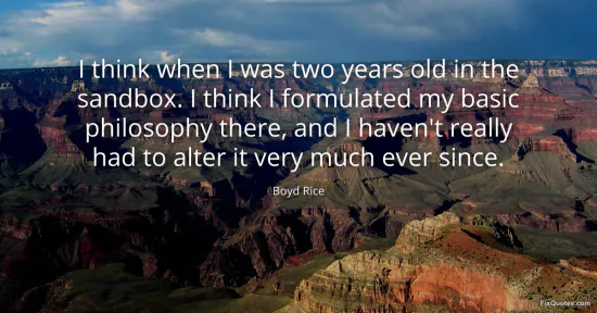 Rice, Boyd. (2026, January 18). I think when I was two years old in the sandbox. I think I formulated my basic philosophy there, and I haven't really had to alter it very much ever since. FixQuotes. https://fixquotes.com/quotes/i-think-when-i-was-two-years-old-in-the-sandbox-i-18470/