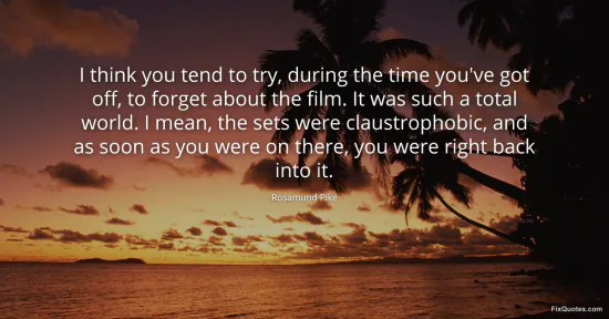Pike, Rosamund. "I think you tend to try, during the time you've got off, to forget about the film. It was such a total world. I mean, the sets were claustrophobic, and as soon as you were on there, you were right back into it." FixQuotes. January 15, 2026. https://fixquotes.com/quotes/i-think-you-tend-to-try-during-the-time-youve-got-151287/.