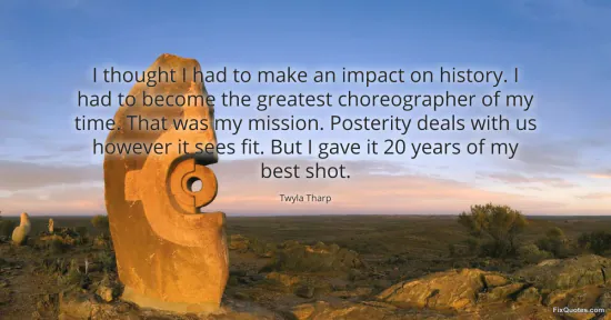 Tharp, Twyla. "I thought I had to make an impact on history. I had to become the greatest choreographer of my time. That was my mission. Posterity deals with us however it sees fit. But I gave it 20 years of my best shot." FixQuotes. January 17, 2026. https://fixquotes.com/quotes/i-thought-i-had-to-make-an-impact-on-history-i-78713/.