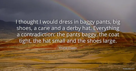 "I thought I would dress in baggy pants, big shoes, a cane and a derby hat. Everything a contradiction: the pants baggy, the coat tight, the hat small and the shoes large." FixQuotes, 19 Feb. 2026, https://fixquotes.com/quotes/i-thought-i-would-dress-in-baggy-pants-big-shoes-30522/. Accessed 4 Mar. 2026.