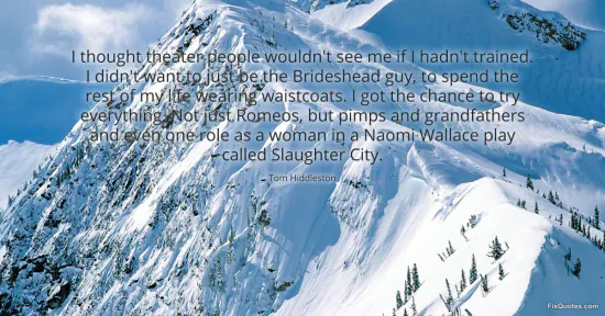 Hiddleston, Tom. (2026, January 16). I thought theater people wouldn't see me if I hadn't trained. I didn't want to just be the Brideshead guy, to spend the rest of my life wearing waistcoats. I got the chance to try everything. Not just Romeos, but pimps and grandfathers and even one role as a woman in a Naomi Wallace play called Slaughter City. FixQuotes. https://fixquotes.com/quotes/i-thought-theater-people-wouldnt-see-me-if-i-131114/