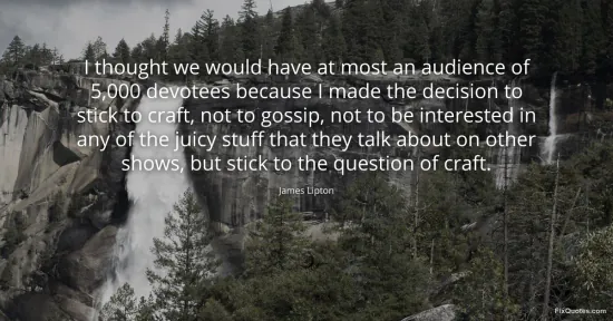 Lipton, James. "I thought we would have at most an audience of 5,000 devotees because I made the decision to stick to craft, not to gossip, not to be interested in any of the juicy stuff that they talk about on other shows, but stick to the question of craft." FixQuotes. January 16, 2026. https://fixquotes.com/quotes/i-thought-we-would-have-at-most-an-audience-of-99095/.