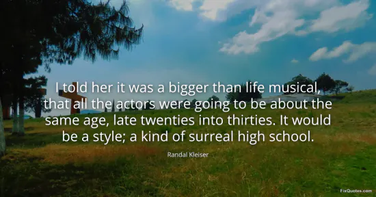 Kleiser, Randal. "I told her it was a bigger than life musical, that all the actors were going to be about the same age, late twenties into thirties. It would be a style; a kind of surreal high school." FixQuotes. January 16, 2026. https://fixquotes.com/quotes/i-told-her-it-was-a-bigger-than-life-musical-that-106537/.