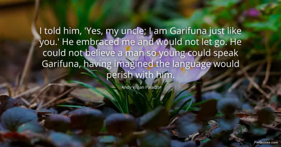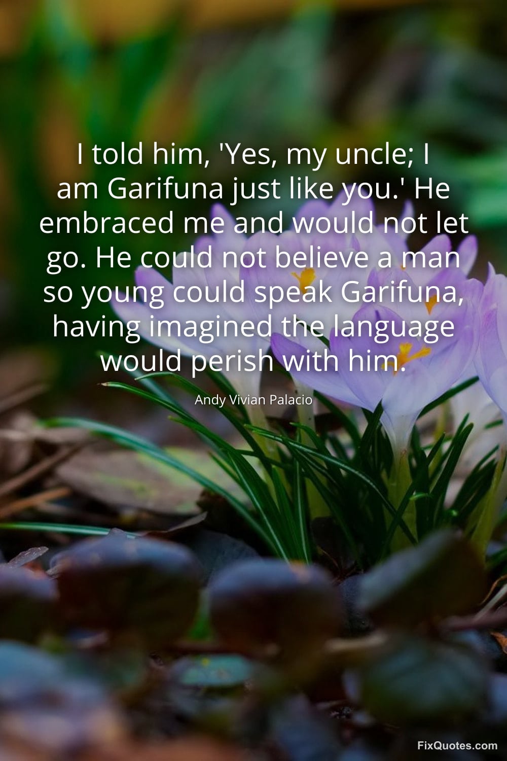 Palacio, Andy Vivian. (2026, February 16). I told him, 'Yes, my uncle; I am Garifuna just like you.' He embraced me and would not let go. He could not believe a man so young could speak Garifuna, having imagined the language would perish with him. FixQuotes. https://fixquotes.com/quotes/i-told-him-yes-my-uncle-i-am-garifuna-just-like-185530/
