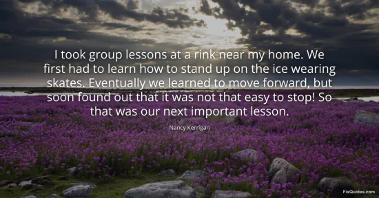 Kerrigan, Nancy. (2026, January 15). I took group lessons at a rink near my home. We first had to learn how to stand up on the ice wearing skates. Eventually we learned to move forward, but soon found out that it was not that easy to stop! So that was our next important lesson. FixQuotes. https://fixquotes.com/quotes/i-took-group-lessons-at-a-rink-near-my-home-we-147345/