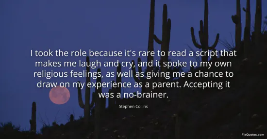 Collins, Stephen. "I took the role because it's rare to read a script that makes me laugh and cry, and it spoke to my own religious feelings, as well as giving me a chance to draw on my experience as a parent. Accepting it was a no-brainer." FixQuotes. January 15, 2026. https://fixquotes.com/quotes/i-took-the-role-because-its-rare-to-read-a-script-165845/.