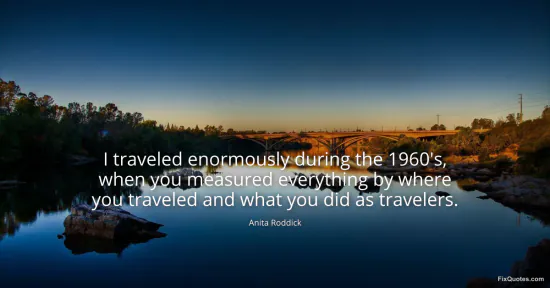 Roddick, Anita. (2026, January 18). I traveled enormously during the 1960's, when you measured everything by where you traveled and what you did as travelers. FixQuotes. https://fixquotes.com/quotes/i-traveled-enormously-during-the-1960s-when-you-15578/
