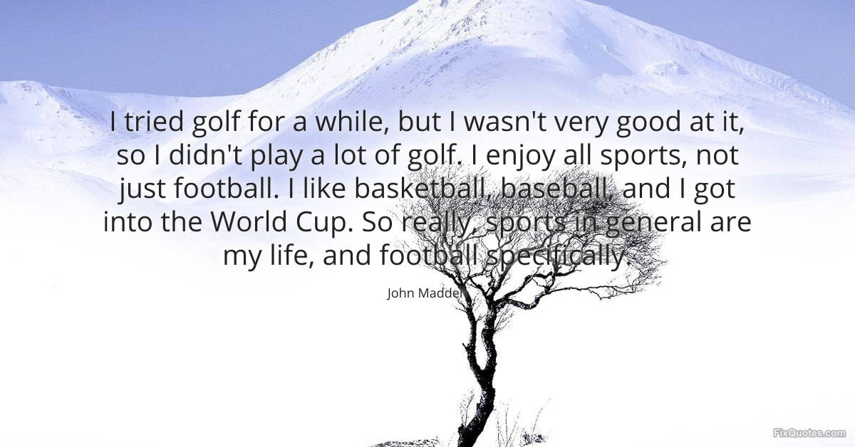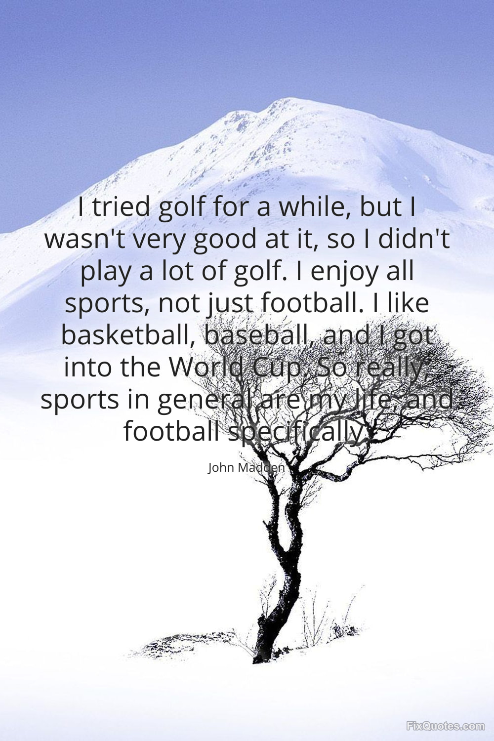 Madden, John. (2026, January 15). I tried golf for a while, but I wasn't very good at it, so I didn't play a lot of golf. I enjoy all sports, not just football. I like basketball, baseball, and I got into the World Cup. So really, sports in general are my life, and football specifically. FixQuotes. https://fixquotes.com/quotes/i-tried-golf-for-a-while-but-i-wasnt-very-good-at-173580/