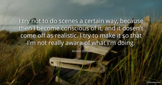 Dunst, Kirsten. (2026, January 17). I try not to do scenes a certain way, because then I become conscious of it, and it dosen't come off as realistic. I try to make it so that I'm not really aware of what I'm doing. FixQuotes. https://fixquotes.com/quotes/i-try-not-to-do-scenes-a-certain-way-because-then-75670/