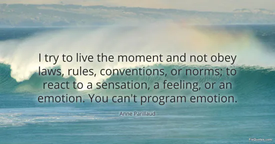 Parillaud, Anne. "I try to live the moment and not obey laws, rules, conventions, or norms; to react to a sensation, a feeling, or an emotion. You can't program emotion." FixQuotes. January 16, 2026. https://fixquotes.com/quotes/i-try-to-live-the-moment-and-not-obey-laws-rules-122757/.