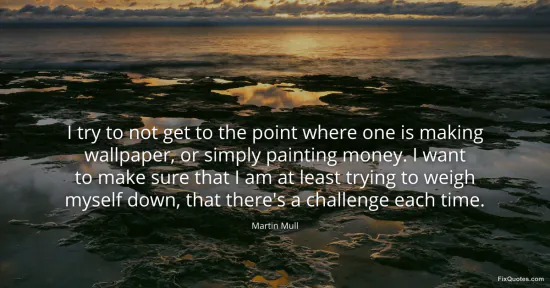Mull, Martin. "I try to not get to the point where one is making wallpaper, or simply painting money. I want to make sure that I am at least trying to weigh myself down, that there's a challenge each time." FixQuotes. January 16, 2026. https://fixquotes.com/quotes/i-try-to-not-get-to-the-point-where-one-is-making-96831/.