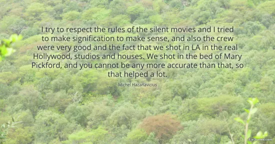Hazanavicius, Michel. (2026, January 15). I try to respect the rules of the silent movies and I tried to make signification to make sense, and also the crew were very good and the fact that we shot in LA in the real Hollywood, studios and houses. We shot in the bed of Mary Pickford, and you cannot be any more accurate than that, so that helped a lot. FixQuotes. https://fixquotes.com/quotes/i-try-to-respect-the-rules-of-the-silent-movies-155810/
