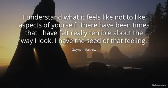 Paltrow, Gwyneth. (2026, January 15). I understand what it feels like not to like aspects of yourself. There have been times that I have felt really terrible about the way I look. I have the seed of that feeling. FixQuotes. https://fixquotes.com/quotes/i-understand-what-it-feels-like-not-to-like-150892/