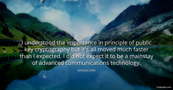 Diffie, Whitfield. "I understood the importance in principle of public key cryptography but it's all moved much faster than I expected. I did not expect it to be a mainstay of advanced communications technology." FixQuotes. January 14, 2026. https://fixquotes.com/quotes/i-understood-the-importance-in-principle-of-130248/.