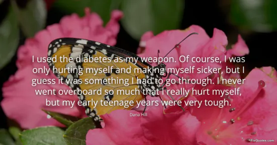 Hill, Dana. "I used the diabetes as my weapon. Of course, I was only hurting myself and making myself sicker, but I guess it was something I had to go through. I never went overboard so much that I really hurt myself, but my early teenage years were very tough." FixQuotes. January 17, 2026. https://fixquotes.com/quotes/i-used-the-diabetes-as-my-weapon-of-course-i-was-50017/.