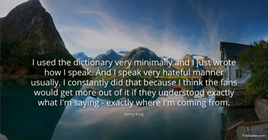 King, Kerry. "I used the dictionary very minimally and I just wrote how I speak. And I speak very hateful manner usually. I constantly did that because I think the fans would get more out of it if they understood exactly what I'm saying - exactly where I'm coming from." FixQuotes. January 17, 2026. https://fixquotes.com/quotes/i-used-the-dictionary-very-minimally-and-i-just-73856/.