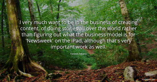 Zakaria, Fareed. "I very much want to be in the business of creating content, of doing stories all over the world rather than figuring out what the business model is for 'Newsweek' on the iPad, although that's very important work as well." FixQuotes. January 15, 2026. https://fixquotes.com/quotes/i-very-much-want-to-be-in-the-business-of-148145/.