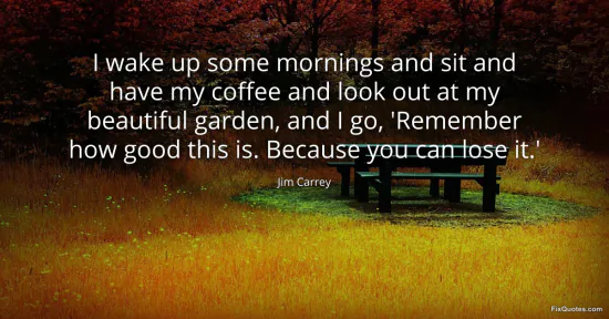 Carrey, Jim. (2026, January 18). I wake up some mornings and sit and have my coffee and look out at my beautiful garden, and I go, 'Remember how good this is. Because you can lose it.'. FixQuotes. https://fixquotes.com/quotes/i-wake-up-some-mornings-and-sit-and-have-my-7759/