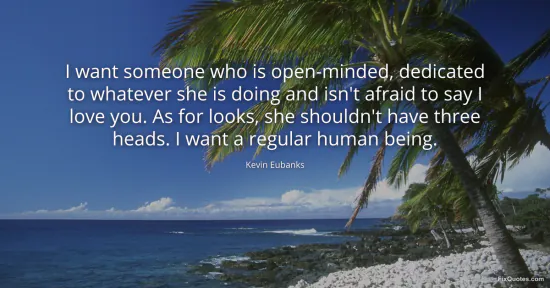 Eubanks, Kevin. (2026, January 15). I want someone who is open-minded, dedicated to whatever she is doing and isn't afraid to say I love you. As for looks, she shouldn't have three heads. I want a regular human being. FixQuotes. https://fixquotes.com/quotes/i-want-someone-who-is-open-minded-dedicated-to-156504/