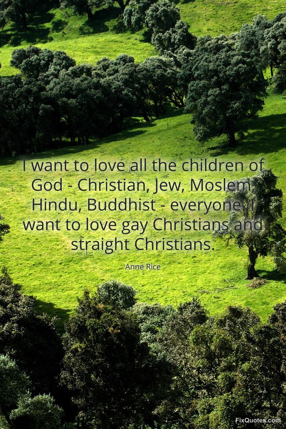 Rice, Anne. "I want to love all the children of God - Christian, Jew, Moslem, Hindu, Buddhist - everyone. I want to love gay Christians and straight Christians." FixQuotes. January 16, 2026. https://fixquotes.com/quotes/i-want-to-love-all-the-children-of-god-138152/.
