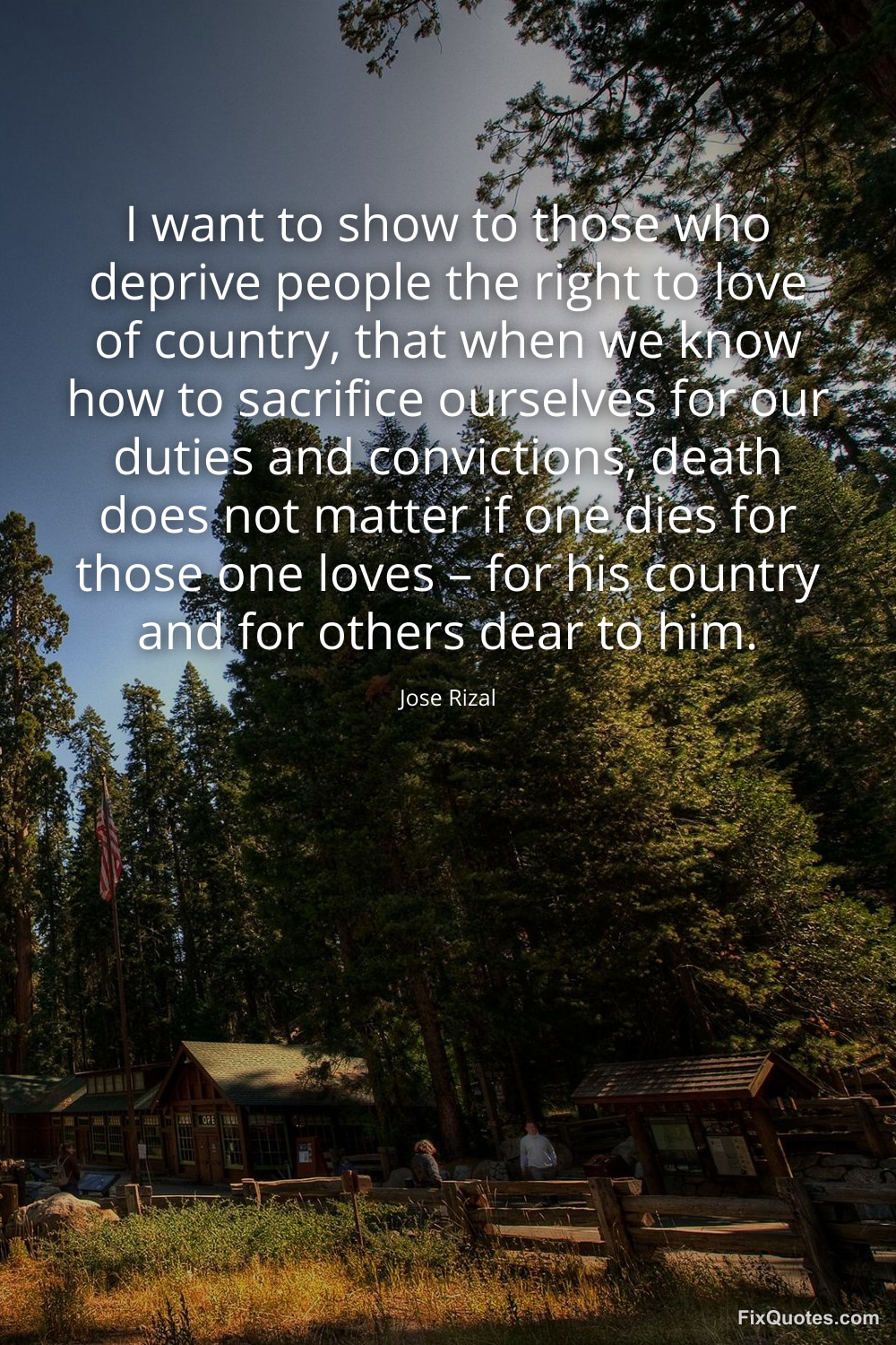 Rizal, Jose. (2026, January 14). I want to show to those who deprive people the right to love of country, that when we know how to sacrifice ourselves for our duties and convictions, death does not matter if one dies for those one loves – for his country and for others dear to him. FixQuotes. https://fixquotes.com/quotes/i-want-to-show-to-those-who-deprive-people-the-173353/