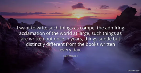 MacLane, Mary. "I want to write such things as compel the admiring acclamation of the world at large, such things as are written but once in years, things subtle but distinctly different from the books written every day." FixQuotes. January 16, 2026. https://fixquotes.com/quotes/i-want-to-write-such-things-as-compel-the-115121/.