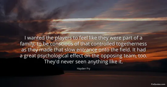 Fry, Hayden. "I wanted the players to feel like they were part of a family, to be conscious of that controlled togetherness as they made that slow entrance onto the field. It had a great psychological effect on the opposing team, too. They'd never seen anything like it." FixQuotes. January 15, 2026. https://fixquotes.com/quotes/i-wanted-the-players-to-feel-like-they-were-part-144002/.