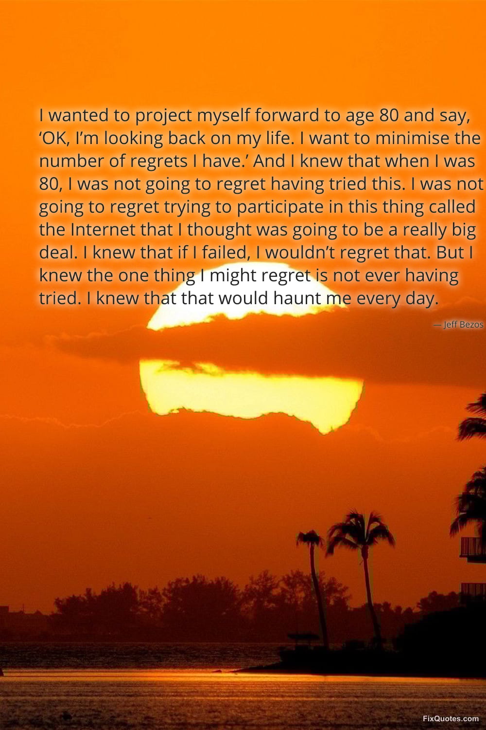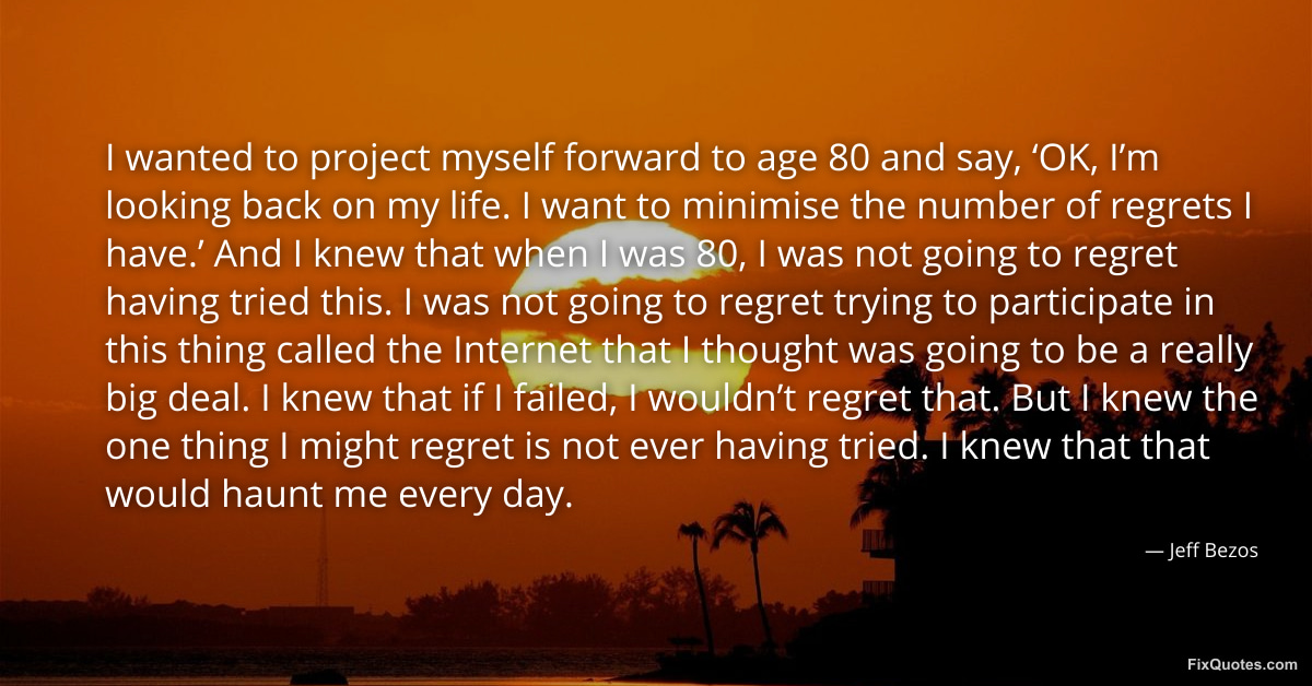 Bezos, Jeff. (2026, March 25). I wanted to project myself forward to age 80 and say, ‘OK, I’m looking back on my life. I want to minimise the number of regrets I have.’ And I knew that when I was 80, I was not going to regret having tried this. I was not going to regret trying to participate in this thing called the Internet that I thought was going to be a really big deal. I knew that if I failed, I wouldn’t regret that. But I knew the one thing I might regret is not ever having tried. I knew that that would haunt me every day. FixQuotes. https://fixquotes.com/quotes/i-wanted-to-project-myself-forward-to-age-80-and-186394/