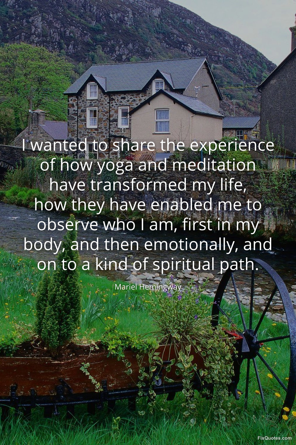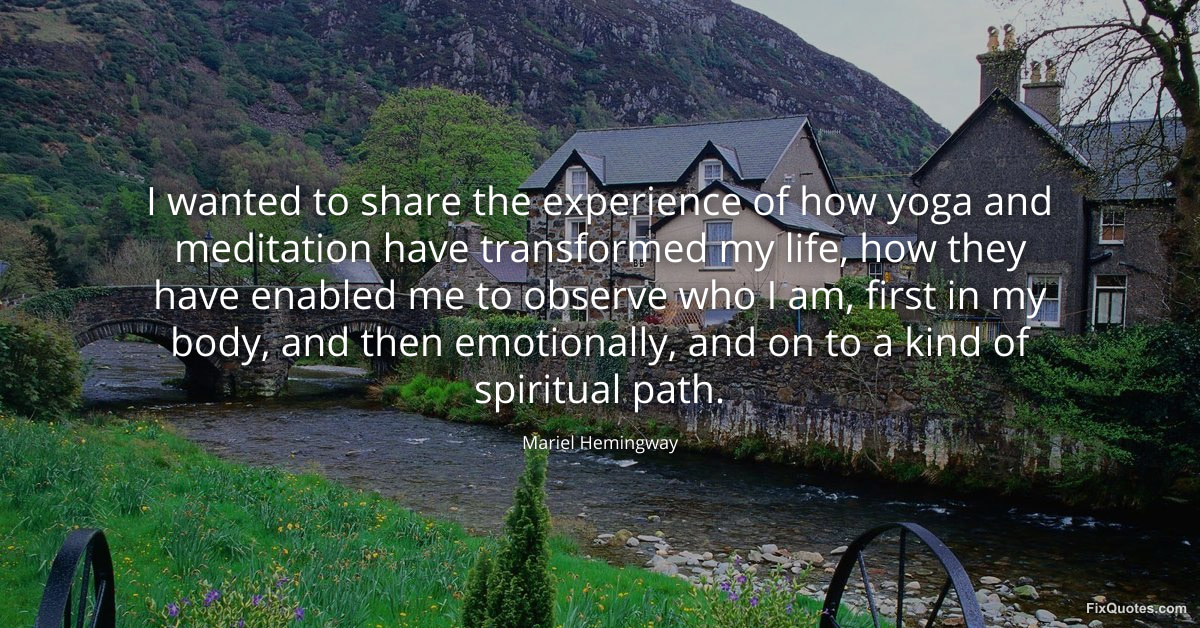 Hemingway, Mariel. "I wanted to share the experience of how yoga and meditation have transformed my life, how they have enabled me to observe who I am, first in my body, and then emotionally, and on to a kind of spiritual path." FixQuotes. January 16, 2026. https://fixquotes.com/quotes/i-wanted-to-share-the-experience-of-how-yoga-and-99497/.