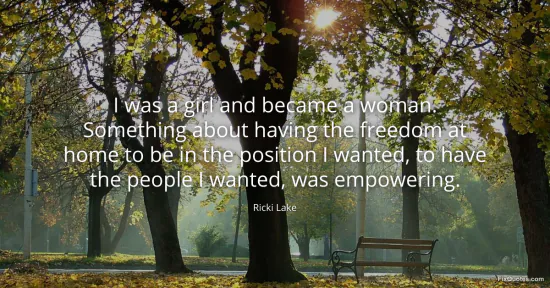 Lake, Ricki. "I was a girl and became a woman. Something about having the freedom at home to be in the position I wanted, to have the people I wanted, was empowering." FixQuotes. January 15, 2026. https://fixquotes.com/quotes/i-was-a-girl-and-became-a-woman-something-about-151227/.