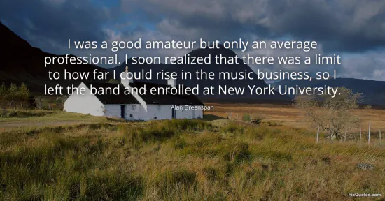 Greenspan, Alan. "I was a good amateur but only an average professional. I soon realized that there was a limit to how far I could rise in the music business, so I left the band and enrolled at New York University." FixQuotes. January 16, 2026. https://fixquotes.com/quotes/i-was-a-good-amateur-but-only-an-average-138112/.