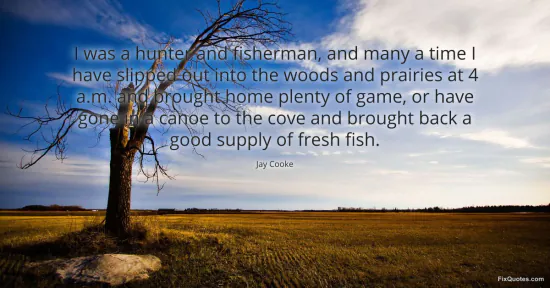 Cooke, Jay. (2026, January 16). I was a hunter and fisherman, and many a time I have slipped out into the woods and prairies at 4 a.m. and brought home plenty of game, or have gone in a canoe to the cove and brought back a good supply of fresh fish. FixQuotes. https://fixquotes.com/quotes/i-was-a-hunter-and-fisherman-and-many-a-time-i-124850/