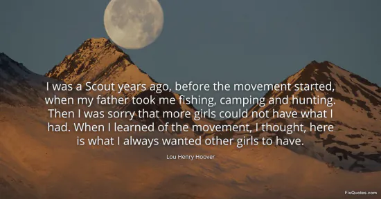 Hoover, Lou Henry. "I was a Scout years ago, before the movement started, when my father took me fishing, camping and hunting. Then I was sorry that more girls could not have what I had. When I learned of the movement, I thought, here is what I always wanted other girls to have." FixQuotes. January 15, 2026. https://fixquotes.com/quotes/i-was-a-scout-years-ago-before-the-movement-146811/.