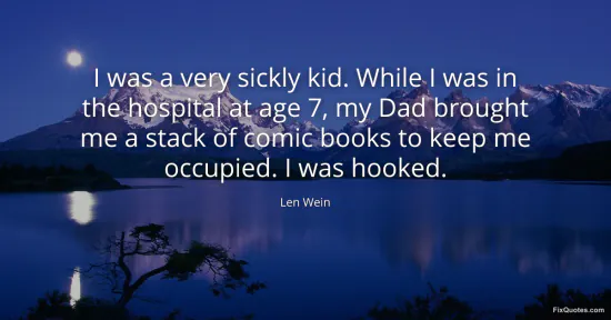 Wein, Len. "I was a very sickly kid. While I was in the hospital at age 7, my Dad brought me a stack of comic books to keep me occupied. I was hooked." FixQuotes. January 17, 2026. https://fixquotes.com/quotes/i-was-a-very-sickly-kid-while-i-was-in-the-62433/.