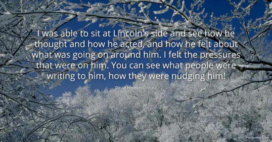 Donald, David Herbert. "I was able to sit at Lincoln's side and see how he thought and how he acted, and how he felt about what was going on around him. I felt the pressures that were on him. You can see what people were writing to him, how they were nudging him!" FixQuotes. February 19, 2026. https://fixquotes.com/quotes/i-was-able-to-sit-at-lincolns-side-and-see-how-he-48327/.