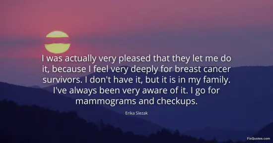 Slezak, Erika. "I was actually very pleased that they let me do it, because I feel very deeply for breast cancer survivors. I don't have it, but it is in my family. I've always been very aware of it. I go for mammograms and checkups." FixQuotes. January 16, 2026. https://fixquotes.com/quotes/i-was-actually-very-pleased-that-they-let-me-do-124792/.