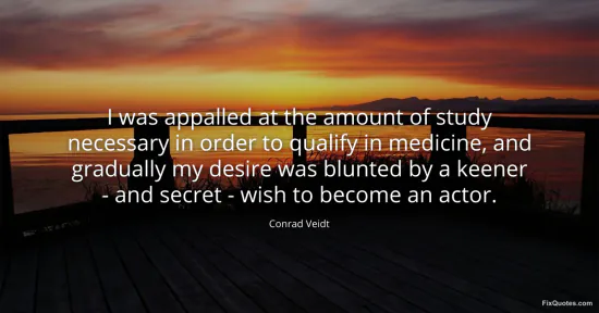 Veidt, Conrad. (2026, January 17). I was appalled at the amount of study necessary in order to qualify in medicine, and gradually my desire was blunted by a keener - and secret - wish to become an actor. FixQuotes. https://fixquotes.com/quotes/i-was-appalled-at-the-amount-of-study-necessary-39624/