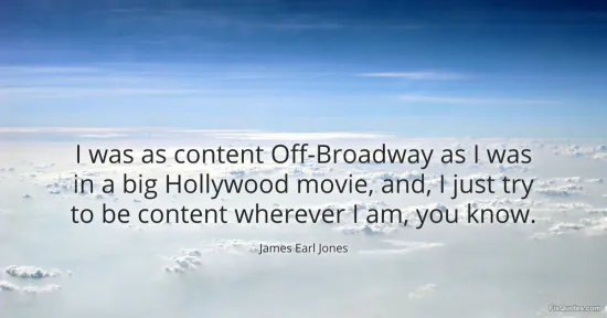 Jones, James Earl. (2026, January 16). I was as content Off-Broadway as I was in a big Hollywood movie, and, I just try to be content wherever I am, you know. FixQuotes. https://fixquotes.com/quotes/i-was-as-content-off-broadway-as-i-was-in-a-big-96305/
