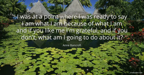 Bancroft, Anne. "I was at a point where I was ready to say I am what I am because of what I am and if you like me I'm grateful, and if you don't, what am I going to do about it?" FixQuotes. January 16, 2026. https://fixquotes.com/quotes/i-was-at-a-point-where-i-was-ready-to-say-i-am-111613/.
